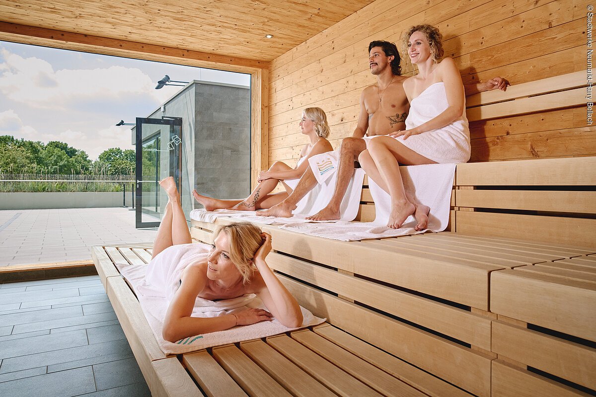 Ein echtes Schmuckstück ist der neue, elegante und überaus großzügige Wellnessbereich auf dem Oberdeck des Schlossbads. Die klassisch finnische Pfalzgrafensauna wird für kreative Aufgusszeremonien genutzt, ebenso wie die „historische“ Wolfsteinsauna aus Keloholz auf dem „Außendeck“ mit Aussicht aufs Freibad und einzigartigem Klima. Einen wunderschönen Panoramablick auf den Schlossweiher genießt man von der kleinen, aber feinen Schlossweihersauna. Eine Salzsauna, ebenfalls im Außenbereich, wirkt wohltuend auf die Atemwege. Sanfte, gut verträgliche Hitze versprechen die Kräutersauna und das Dampfbad im Innenbereich. Eine Neumarkter Besonderheit sind auch die kreativen Aufgusszeremonien und „Banjas“, für die der Saunameister ausschließlich hundertprozentige Naturprodukte verwendet. Nicht weniger spektakulär sind auch der große Infinity-Pool auf dem Oberdeck und die großzügig angelegten Ruhebereiche, unter anderem mit einer Kamin-Lounge, wo man bei flackerndem Feuer in luxuriösen Hängeliegen relaxen kann. Als weiteres Highlight gilt die exklusive Saunagastronomie mit regionalen Spezialitäten vom Panino „Weideglück“ bis zu Superfood-Bowls und Champagner. Genuss hat eben viele schöne Seiten im neuen Schlossbad