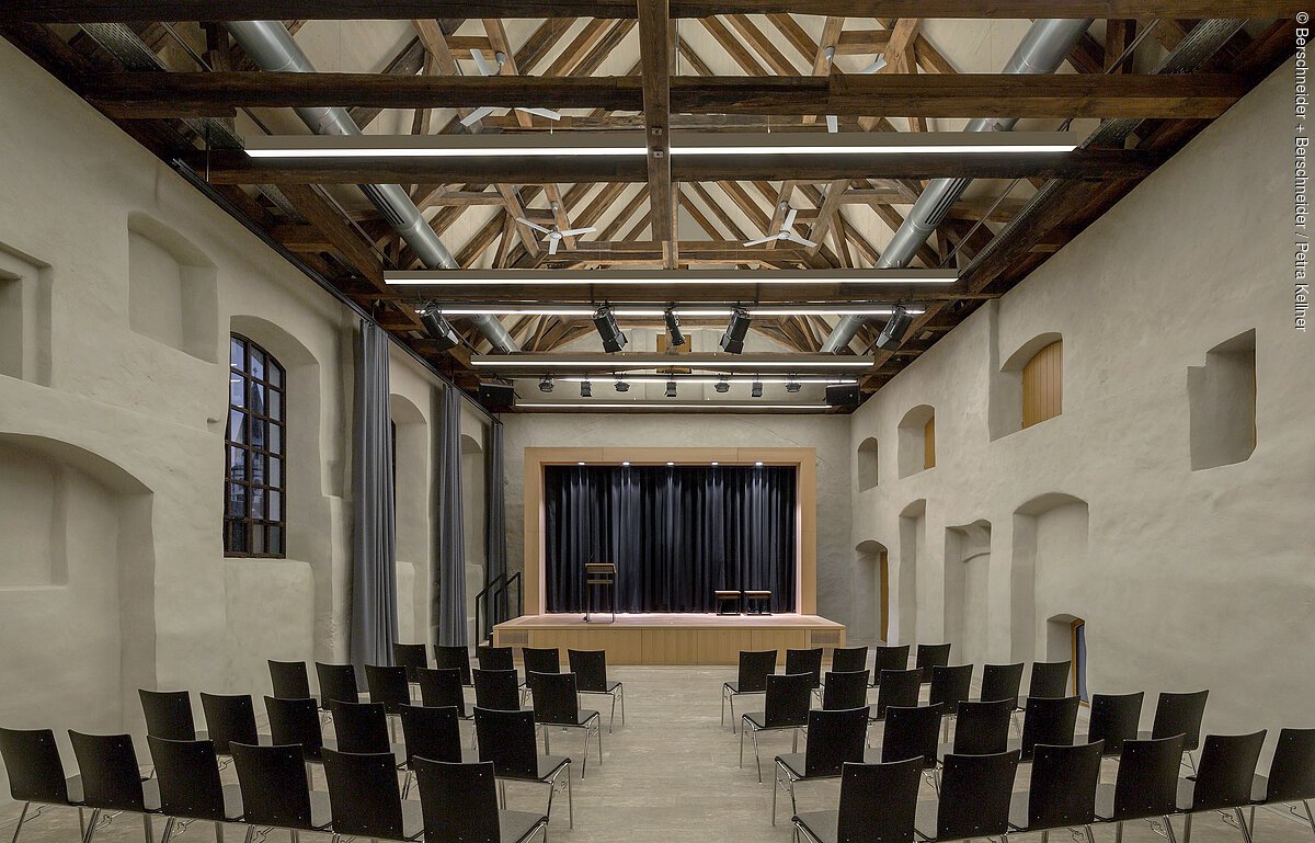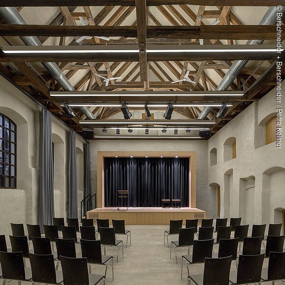 An der Evangelischen Christuskirche in den historischen Räumlichkeiten eines ehemaligen Kapuzinerklosters ist ein städtebauliches Kleinod allererster Güte entstanden. Das Gebäude der ehemaligen Klosterbrauerei, das über viele Jahre auch eine Diskothek beherbergte, wurde von der Stadt Neumarkt 2016 zu einem großen und modernen Veranstaltungssaal umgebaut und an die Evangelische Kirche vermietet, die sich in dem Areal auch ihr neues Gemeindezentrum eingerichtet hat. Das mit viel Liebe zum historischen Ort neu geschaffene Ensemble bedeutet eine Aufwertung des gesamten Areals am Rande der Neumarkter Altstadt. Der neue Klostersaal ist eine gelungene architektonische Verbindung von Alt und Neu, die in der behutsamen Umgestaltung des historischen Gebäudes unter Verwendung hochwertiger Materialien wie Eichenholz und Messing ihren Ausdruck findet. In enger Zusammenarbeit mit dem Denkmalschutz konnten in vielen Details spannende, substanzerhaltende Lösungen gefunden werden.