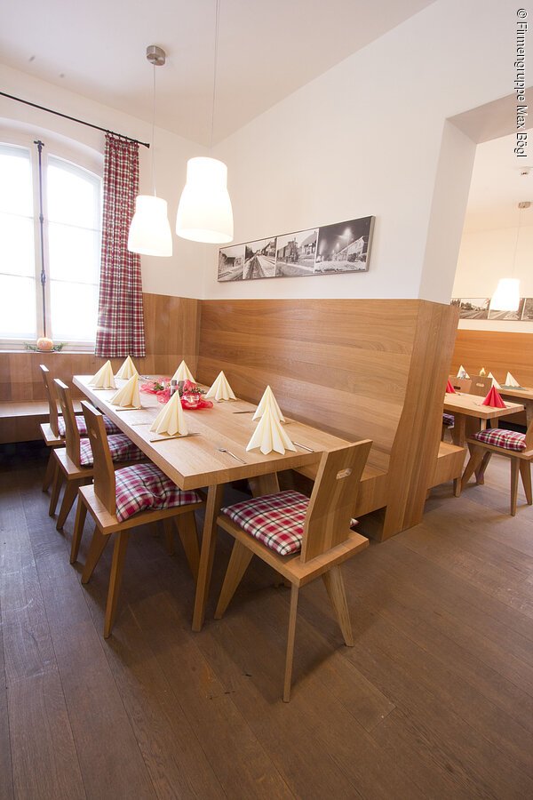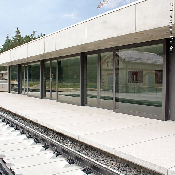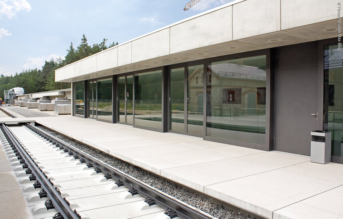 Die Wissensakademie der Firmengruppe Max Bögl entstand am Hauptsitz in Sengenthal. Spektakulärstes Ausstellungstück ist eine Hälfte des Transrapid TR07. Für das werkseigene Innovations- und Schulungszentrum wurde der alte Bahnhof Greißelbach saniert. Das denkmalgeschützte Bahnhofsbauwerk bildet den Mittelpunkt des weitläufigen Geländes und beherbergt einen Gastronomiebereich mit Außenbestuhlung auf der Bahnsteigplattform. Die Architekten Bögl Gierer ergänzten den ehrwürdigen alten Bahnhof um ein modernes Schulungsgebäude. Der Neubau hält sich dezent im Hintergrund und verbindet geschickt die Einzelbauwerke zu einer Einheit. Das lang gezogene Schulungsgebäude treppt sich von der Empfangsebene aus nach unten ab. Die Eingangsebene lässt sich vollständig über großformatige Fenster zur Plattform hin öffnen, die Schulungsräume auf der unteren Ebene orientieren sich zum minimalistisch gestalteten Innenhof.