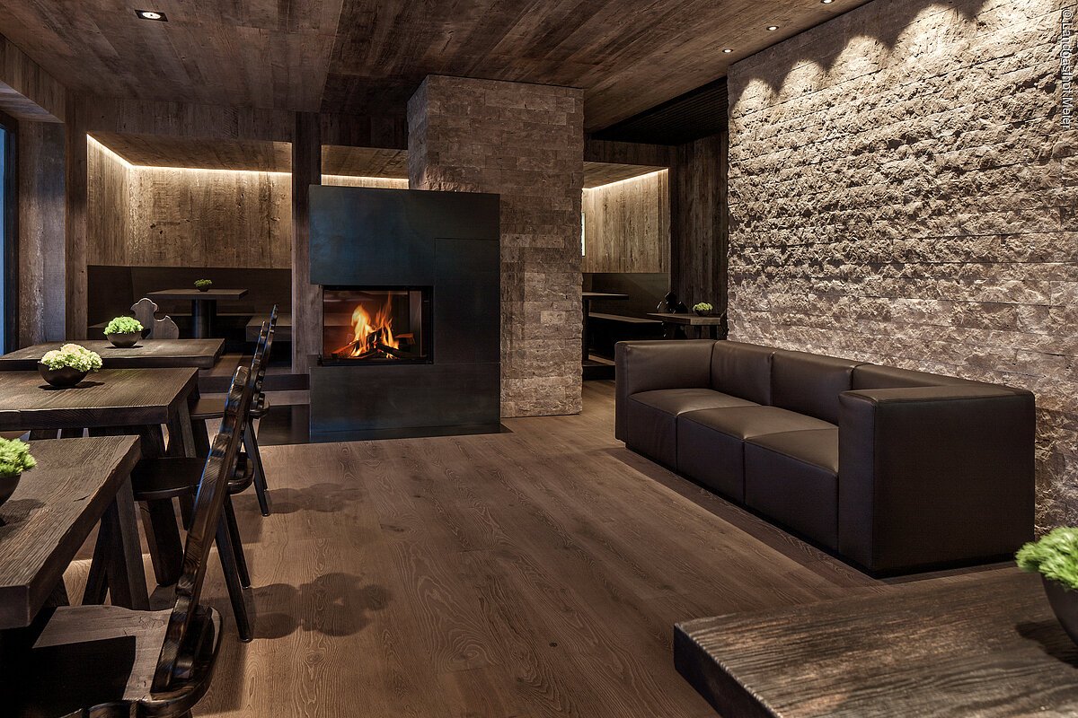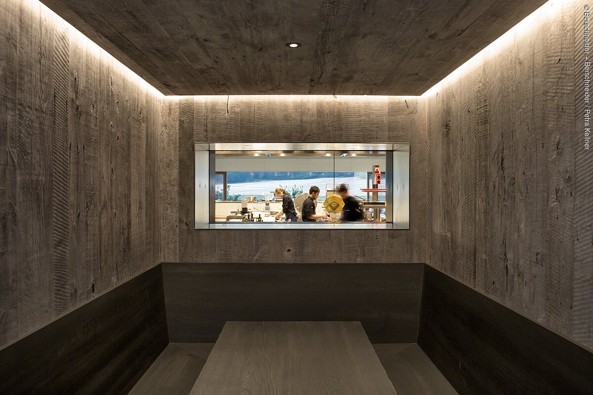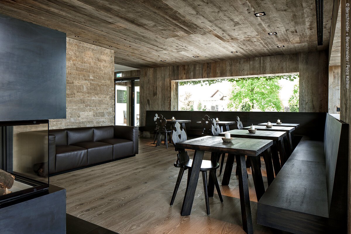 Der alteingesessene Landgasthof im ländlichen Hilzhofen mit gehobener Gastronomie sollte umgebaut und um einen hochprofessionellen neuen Küchentrakt erweitert werden – alles getreu der Philosophie der Besitzer, des gemeinsamen Weges moderner und traditioneller Elemente. Bei Planung und Ausführung legte man größten Wert auf höchste Qualität und Regionalität. Die ehemalige Küche erweitert nun die Gasträume, die eine harmonische Collage aus traditioneller Holzstube mit zeitgemäßer Formensprache bilden. Öffnungen in der Fassade ermöglichen weite Ausblicke in die umliegende Landschaft der Kuppenalb. Der Innenausbau aus Erle Altholz und die handwerklich gefertigten Möbel aus gebeizter Eiche schaffen heimelige Hüttenatmosphäre mit modernen Akzenten. Den zentralen Blickfang im Raum bildet ein Kaminofen mit einer dreiseitig sichtbaren Feuerstelle.