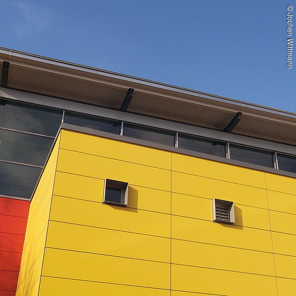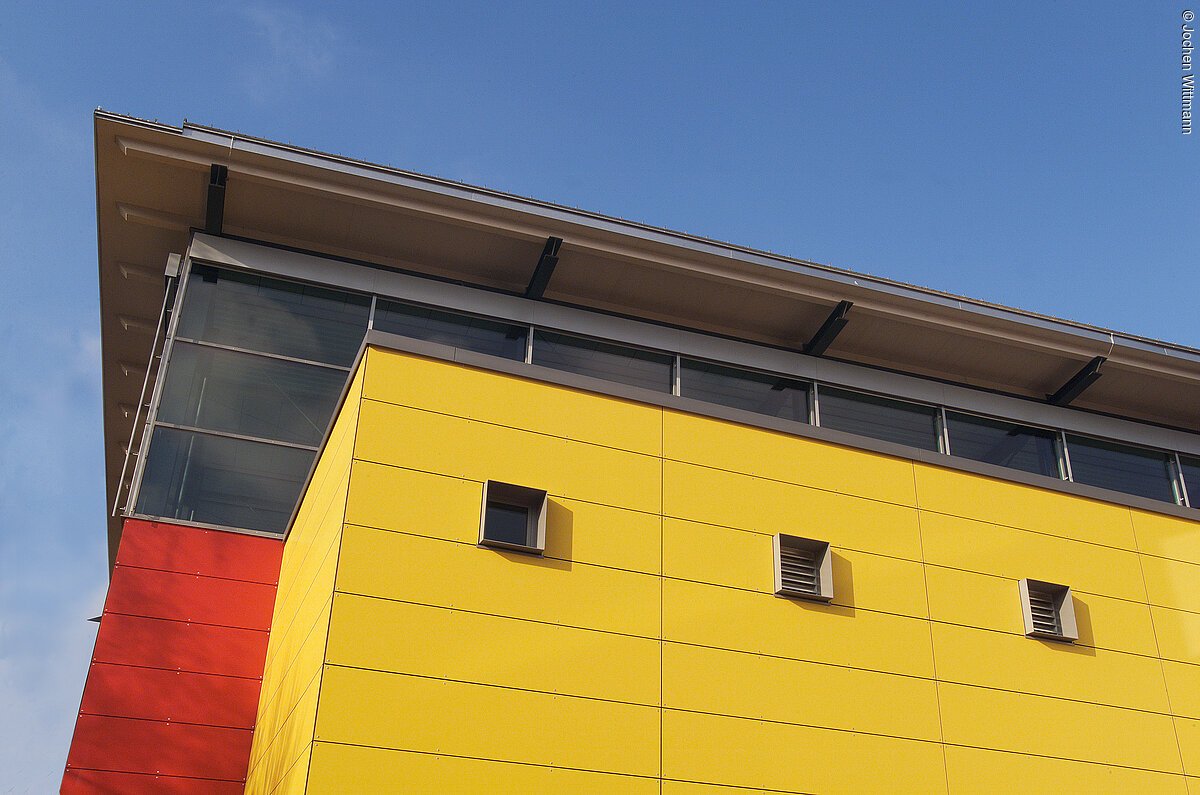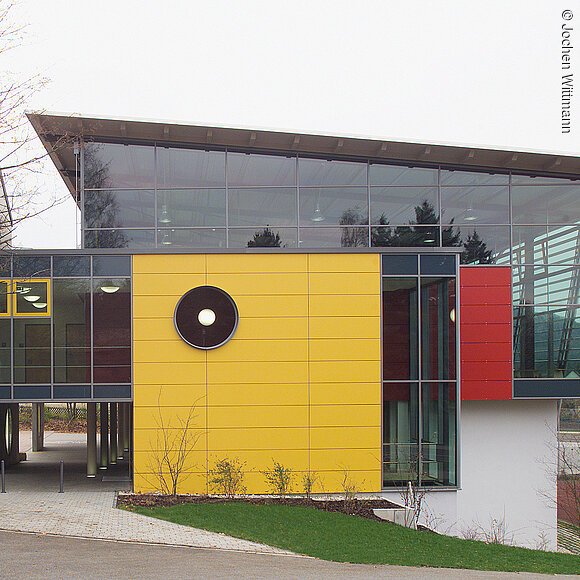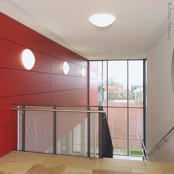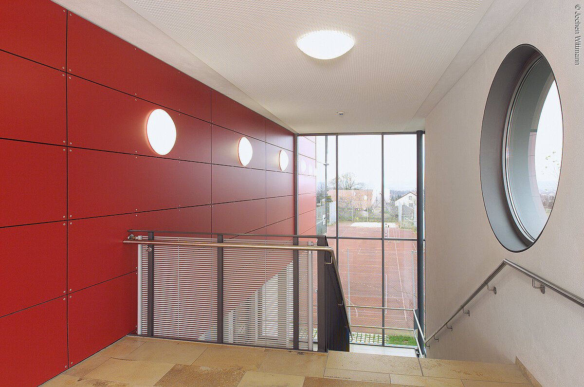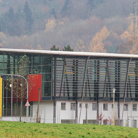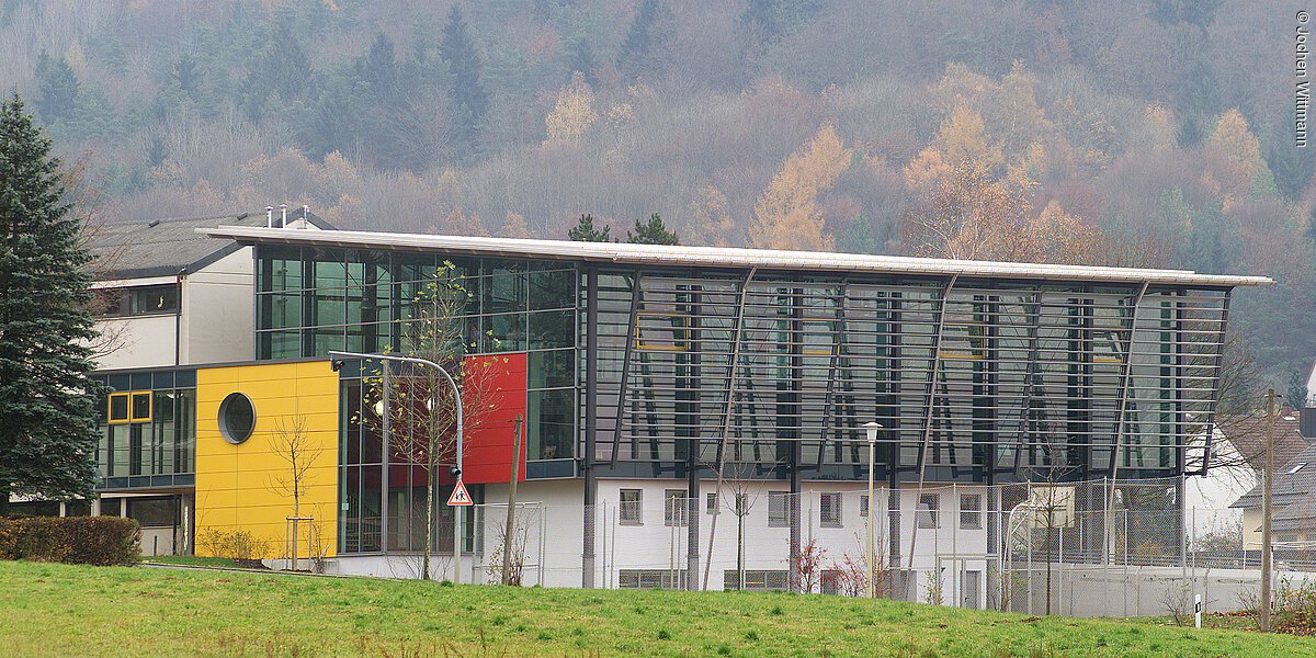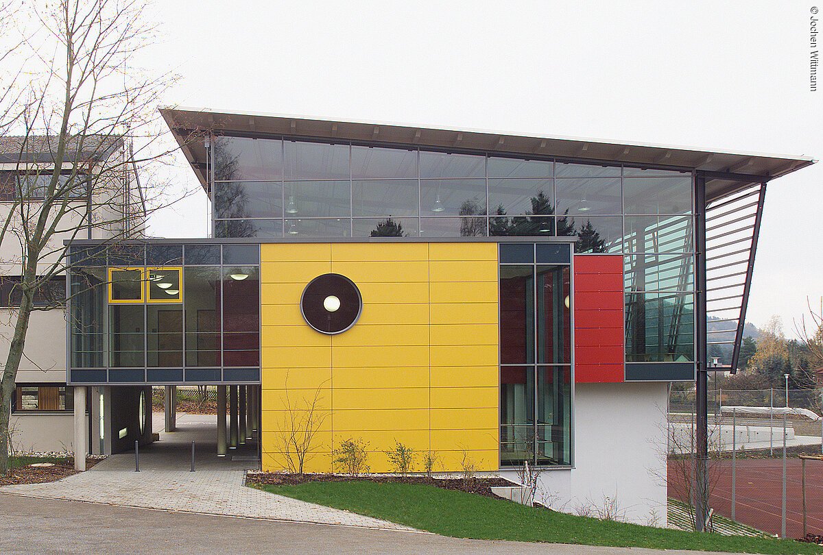 Die exponierte, erhöhte und weithin sichtbare Lage der Wolfsteinschule verlangte nach einem besonderen Entwurf für die neue Schulturnhalle. Dieser gelang Architekt Hans Wittmann durch einen Baukörper mit weitreichender Verglasung hin zum Neumarkter Talkessel, mit dem ein einmaliger Ausblick geschaffen werden konnte – eine für Turnhallen eher ungewöhnliche Bauweise. Eine vorgestellte Stahlkonstruktion trägt die Glasfassade und das mit dem Hang geneigte Pultdach. Ein Flachbau zwischen Halle und Schule wirkt gleichermaßen als Zäsur und Bindeglied, bunte Fassadenplatten geben dem Bau einen spielerischen und lebendigen Charakter.