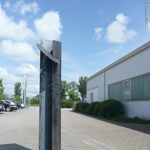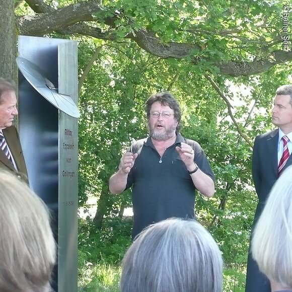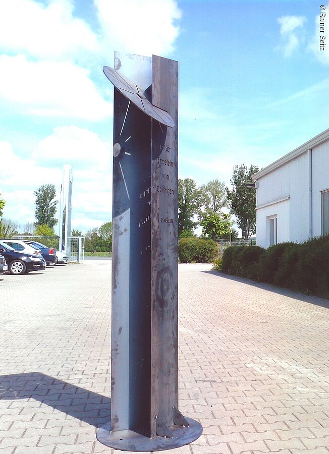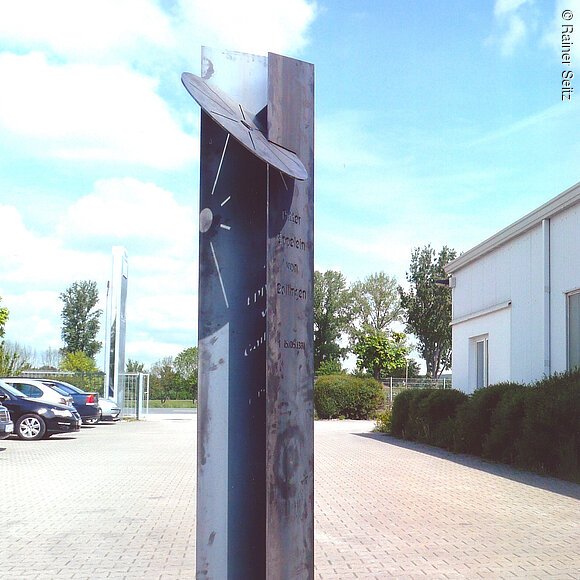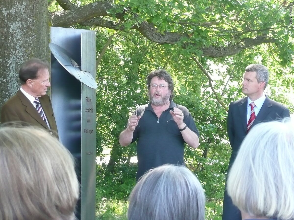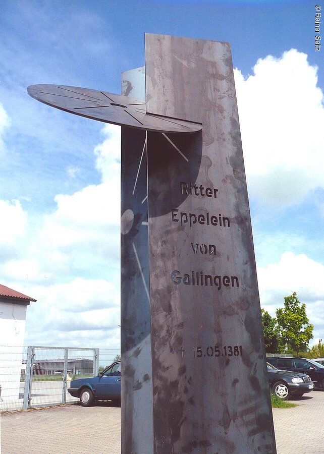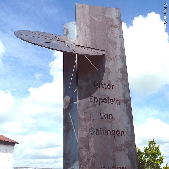 Am 15. Mai 1381 gab es in Neumarkt auf dem Galgenhügel der Stadt, südwestlich des heutigen Bahnhofs, ein außergewöhnliches Spektakel: Die Hinrichtung des gefürchteten und viele Jahre erfolglos gejagten Raubritter Eppelein von Gailingen durch Rädern. Heute erinnert an dieses Ereignis eine Stele in der Hans-Dehn-Straße in Neumarkt. Geschaffen hat sie der Künstler Franz Pröpster Kunzel, der nahe Freystadt lebt und arbeitet. Zwei verkantete Seitenteile aus korrodiertem Stahl halten das Marterwerkzeug, das Rad. Vorne sind ganz schlicht Name und Todestag des Raubritters eingekerbt. Die Inschrift wandert mit der Sonne – bis sie erlischt.