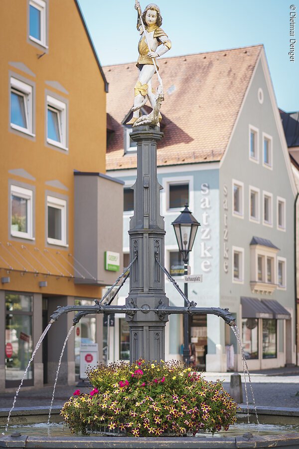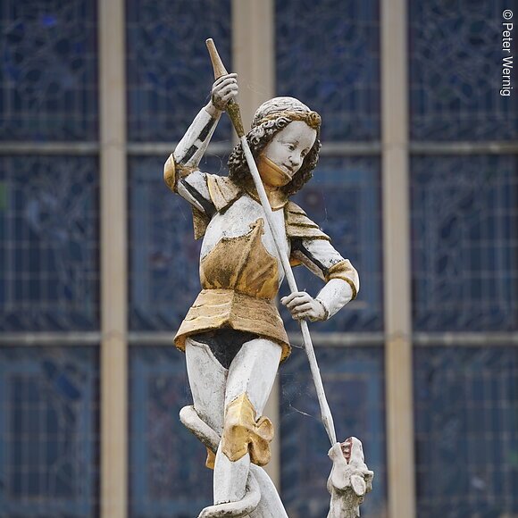 Die Brunnenfigur zeigt den heiligen Georg, der als Drachentöter in die christliche Geschichte einging. Der Legende nach soll der heilige Georg im Gebiet der heutigen Türkei am Schwarzen Meer gelebt und als Legionär für den römischen Kaiser gekämpft haben. Aufgrund seines christlichen Glaubens wurde er jedoch unter dem römischen Kaiser Diokletian gefoltert und hingerichtet, weshalb er seither als Märtyrer verehrt wird. Seinen Beinamen „der Drachentöter“ erhielt er aufgrund folgender Geschichte: Nahe einer Stadt im heutigen Libyen soll ein Drache gelebt haben, der mit seinem giftigen Atem die Luft so verdarb, dass viele Stadtbewohner daran starben. Man beschloss, dem Drachen jeden Tag zwei Schafe zu opfern, um ihn so weit wie möglich von der Stadt fernzuhalten. Als je-doch alle Schafe der Stadt dem Drachen zum Opfer gefallen waren, begann der Drache täglich ein Menschenopfer zu verlangen. Per Los wurde nun jeden Tag entschieden, wen es treffen würde und schließlich fiel das Los auf die Tochter des Königs. Schweren Herzens nahm sie Abschied von ihren Eltern und ging zu dem See vor der Stadt, wo der Drache lebte. Doch bevor der Drache ihr etwas anhaben konnte erschien der heilige Georg, der den Drachen mit seiner Lanze verwundete. Die Königstochter konnte dem nun zahmen Drachen ihren Gürtel um den Hals legen und führte ihn zur Stadt. Als die Bewohner den sich nähernden Drachen sahen, fürchteten sie sich sehr, doch der heilige Georg versprach ihn zu töten, sollten sich die Bewohner der Stadt bereit erklären sich taufen zu lassen. Sie stimmten zu, und so geschah es, dass die Bewohner von der Heimsuchung des Drachen befreit wurden.
