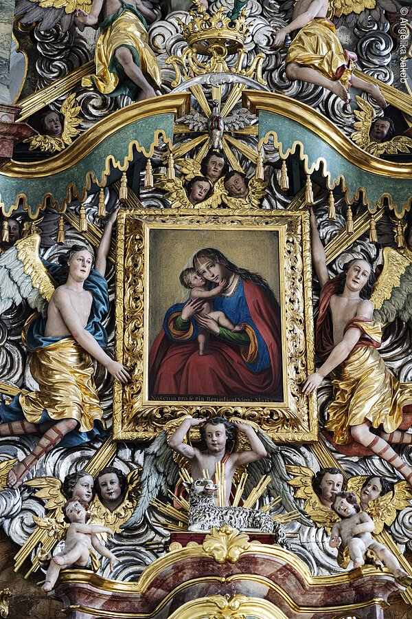 Der Aufstieg über die 367 Stufen des Kreuzwegs ist eine besonders schöne und stimmungsvolle Art und Weise, sich dem Marienwallfahrtsort hoch über der Stadt zu nähern. Erst kurz vor dem Ziel sieht man die von Bäumen umgebene, 1718 bis 1727 erbaute schlichte Barockkirche mit dem rund 30 Meter hohen Kirchturm und die Mauern des kleinen Klosters. Das feine, zurückhaltende Dekor des Kirchenschiffs wirkt nicht überladen, die lichte Stuckierung des lombardischen Künstlers Johann Bajerna mit den erst im 19. und 20. Jahrhundert geschaffenen Deckenfresken strahlt eine heitere Festlichkeit aus. Der reich verzierte barocke Hochaltar von Johann Ulrich Wiest fasst das berühmte Gnadenbild der Jungfrau mit Kind. Ein Silberwolkenfeld mit vielen Engelsköpfchen umrahmt das von zwei Engeln gehaltene Bild, das bis heute in der Bevölkerung tief verehrt wird. Höhepunkte des kirchlichen Lebens sind die Kreuzwegandachten in der Fastenzeit an den Kreuzwegstationen im Wald und vor allem die täglichen Maiandachten im Marienmonat.