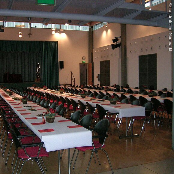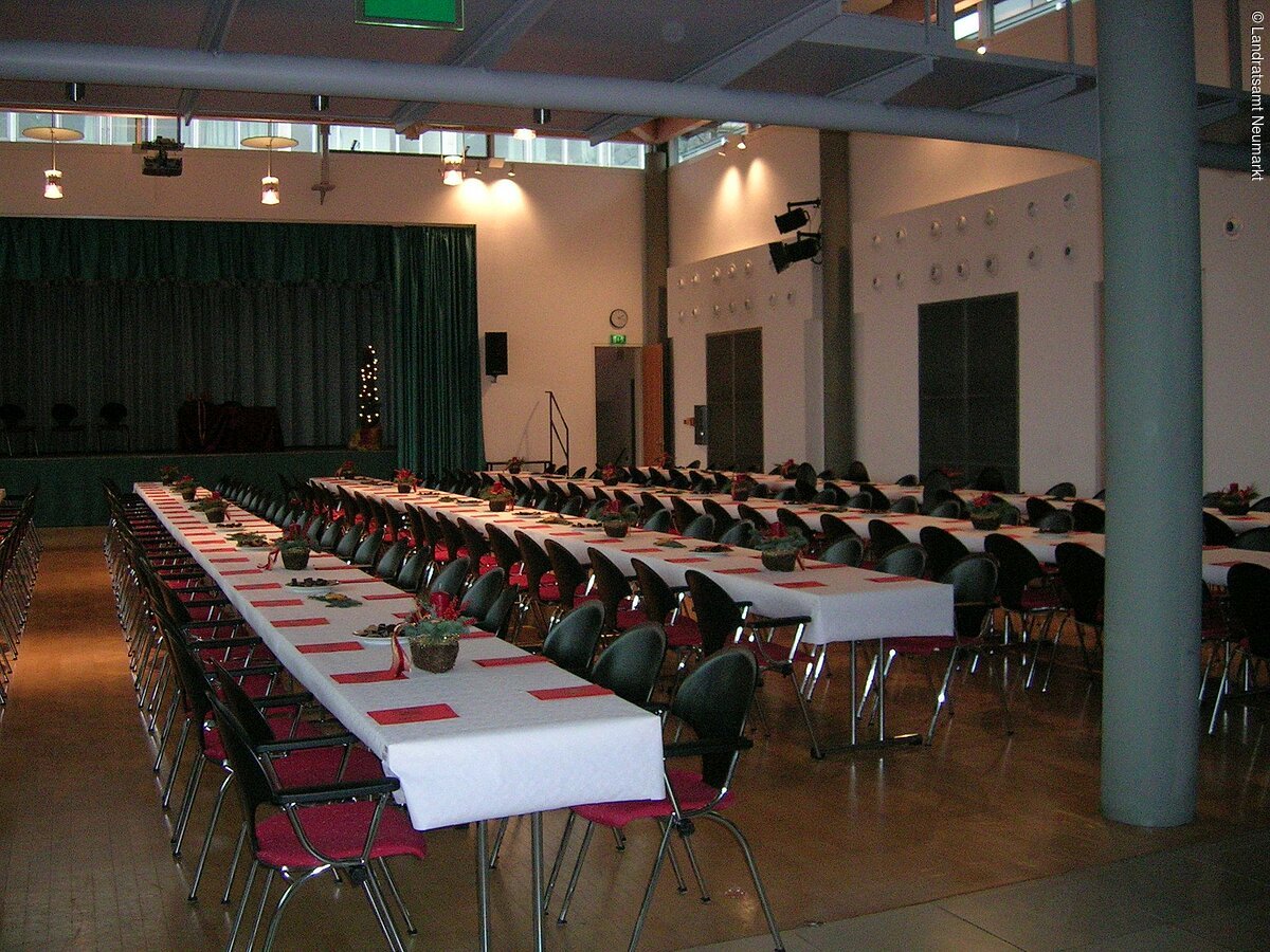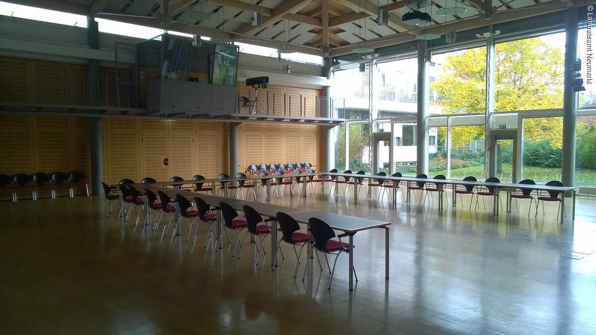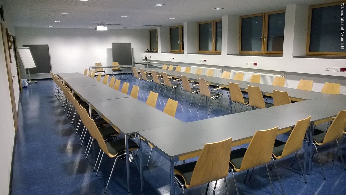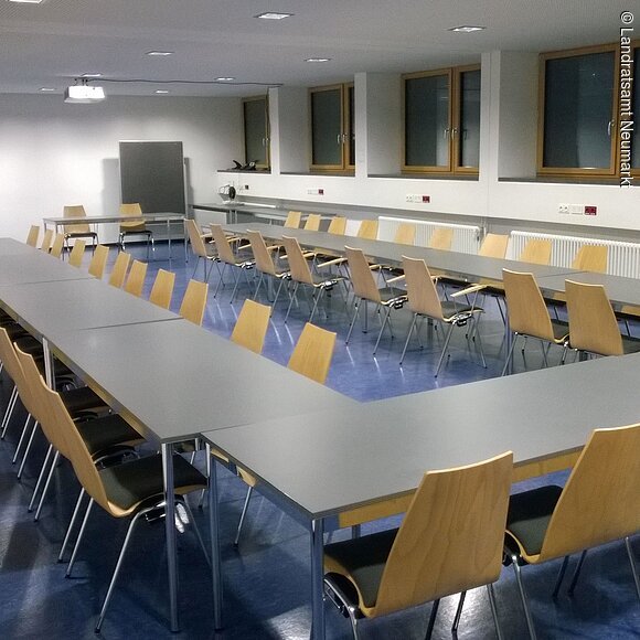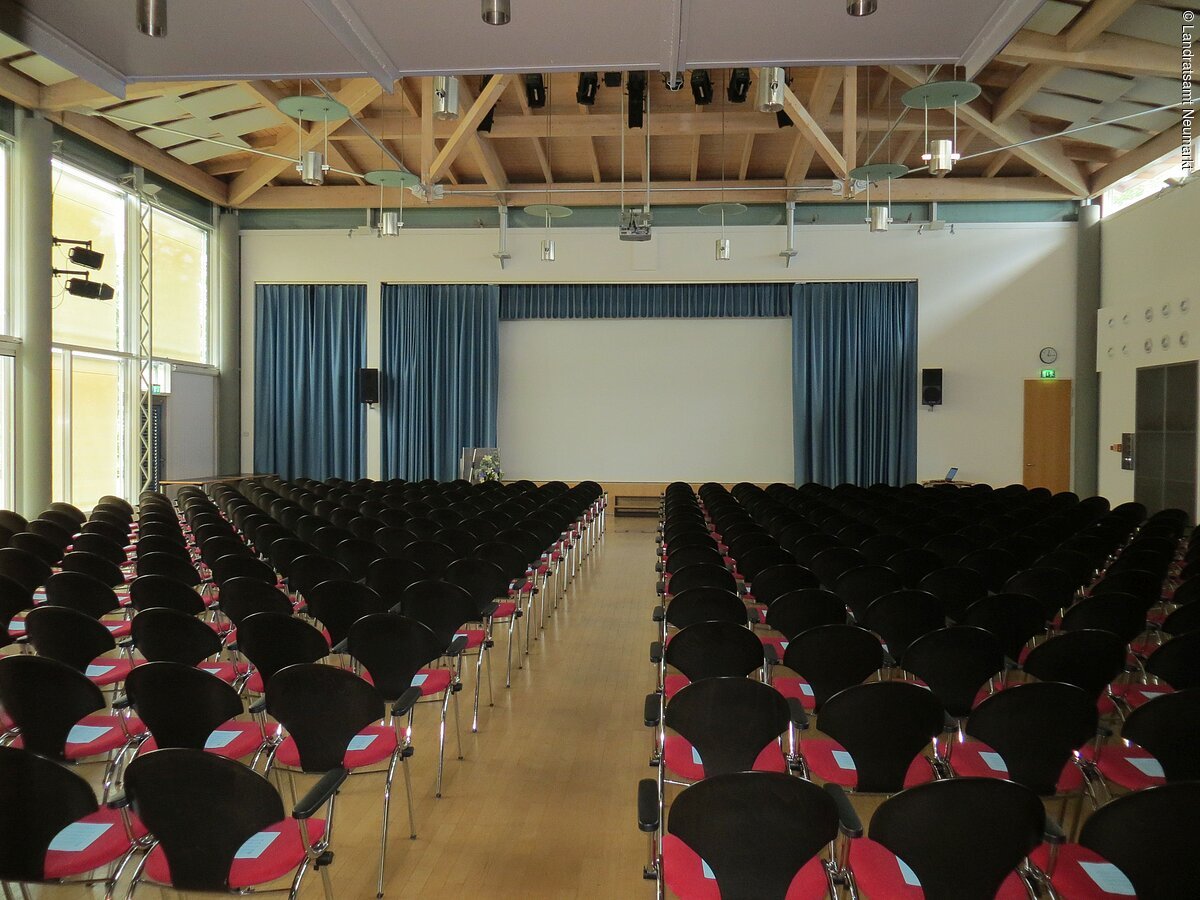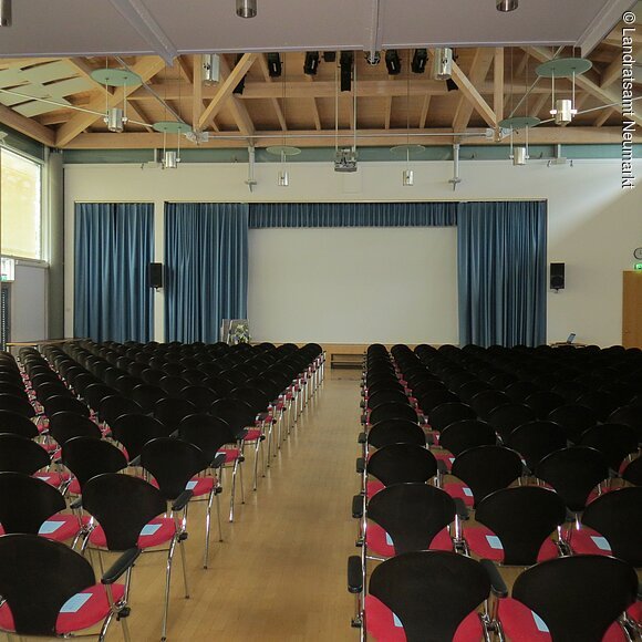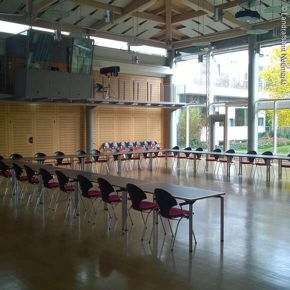 Als „Ort der Begegnung“ ist das Neumarkter Landratsamt offen für jedermann. Von Pressekonferenzen über Tagungen bis hin zu Theateraufführungen, Bankette und Feierlichkeiten: Vieles ist vorstellbar und möglich im großen, lichtdurchfluteten Saal des Landratsamtes. Der barrierefrei zugängliche, moderne Saal im Erdgeschoß bietet bis zu 250 Personen Platz. Große Fensterfronten – natürlich mit Verdunklungsmöglichkeit - geben den Blick auf eine angrenzende Grünfläche frei. Die Aussicht und das schöne, unaufdringlich-wohnliche Ambiente ermöglichen eine angenehme Arbeitsatmosphäre. Vom Beamer bis zur Licht- und Tontechnik und einer flexiblen Bühne ist modernste Tagungs- und Veranstaltungstechnik vorhanden. Zusätzlich gibt es zwei kleinere und einen größeren Tagungsraum (B1, B2 und B3), die ebenfalls angemietet werden können. Im größten der drei Räume B3) können je nach Bestuhlung bis zu 90 Personen Platz finden.