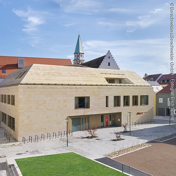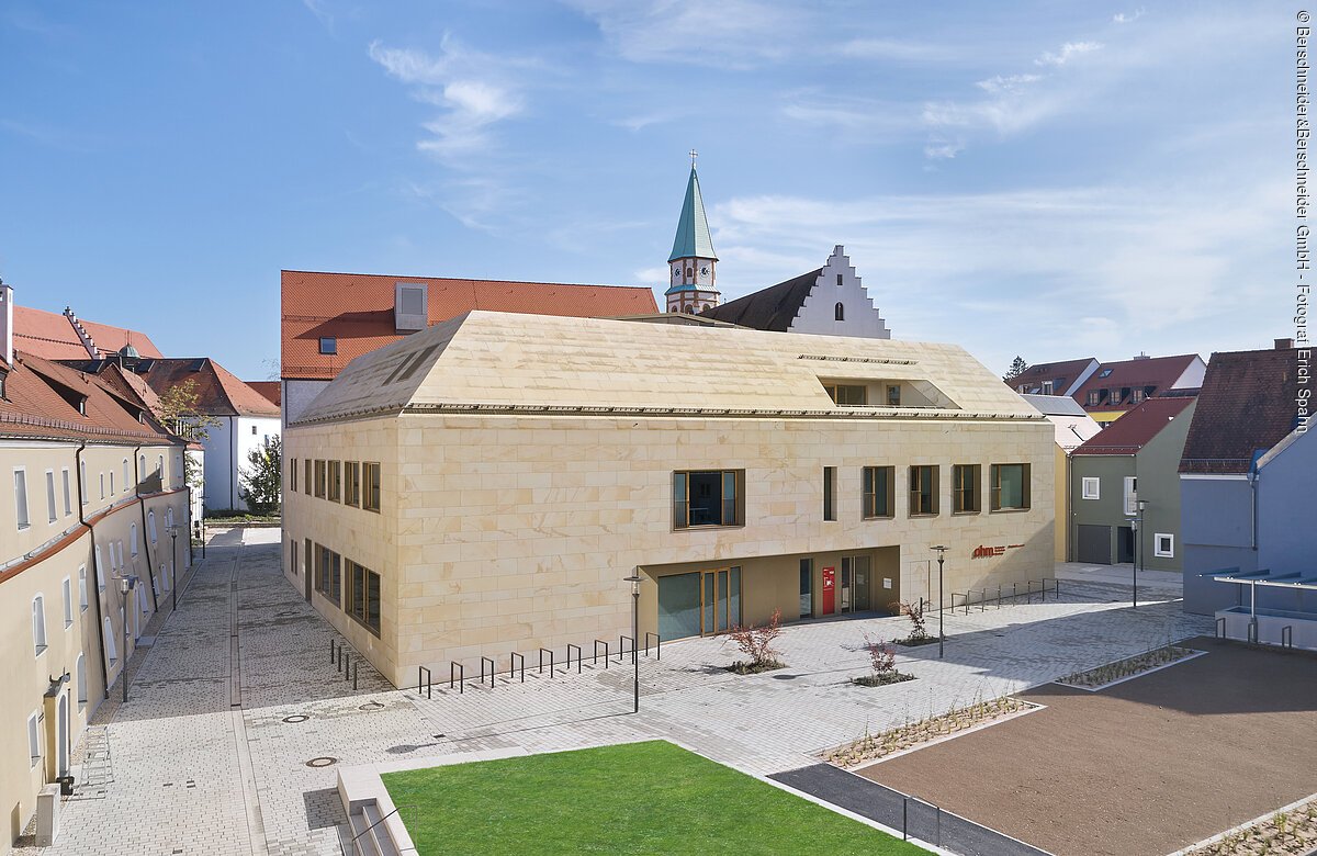 Mitten in der Neumarkter Altstadt, am Residenzplatz, wurde im Herbst 2024 das neue Hochschulgebäude eröffnet. Die Neumarkter Dependance der Technischen Hochschule Nürnberg (Ohm) bietet Studienplätze für bis zu 150 Studierende des Fachbereichs „Management in der Ökobranche“. Der stimmige Baukörper nimmt die Achsen und Fluchten der engen Gassen auf und steht in Harmonie zur historischen Nachbarschaft mit Reitstadel, der Hofkirche und dem ehemaligen Pfalzgrafenschloss am Residenzplatz im Herzen von Neumarkt. Passend zum Fachbereich Ökologie setzten die Architekten auf nachhaltiges Fassadenmaterial: Der Neubau gliedert sich in zwei durch eine Glasfuge getrennte, unterschiedliche Gebäude. Eines davon eine selbstbewusste Skulptur im Sandsteinkleid und einer gleichermaßen ruhigen wie lebendigen Ausstrahlung. Der zweite Baukörper ist ein klarer, rechtwinkliger Kubus mit Satteldach, der das Denkmalensemble am Residenzplatz harmonisch ergänzt.